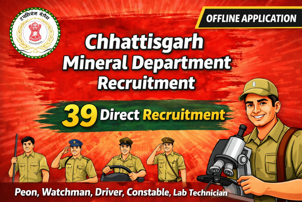 यह लेख छत्तीसगढ़ खनिज विभाग द्वारा जारी भर्ती सूचना और सार्वजनिक रूप से उपलब्ध जानकारियों के आधार पर तैयार किया गया है। भर्ती से संबंधित नियम, पदों की संख्या, योग्यता और तिथियों में विभाग द्वारा परिवर्तन किया जा सकता है। उम्मीदवारों को सलाह दी जाती है कि आवेदन करने से पहले संबंधित विभाग की आधिकारिक अधिसूचना और कार्यालय से प्राप्त जानकारी की पुष्टि अवश्य करें।